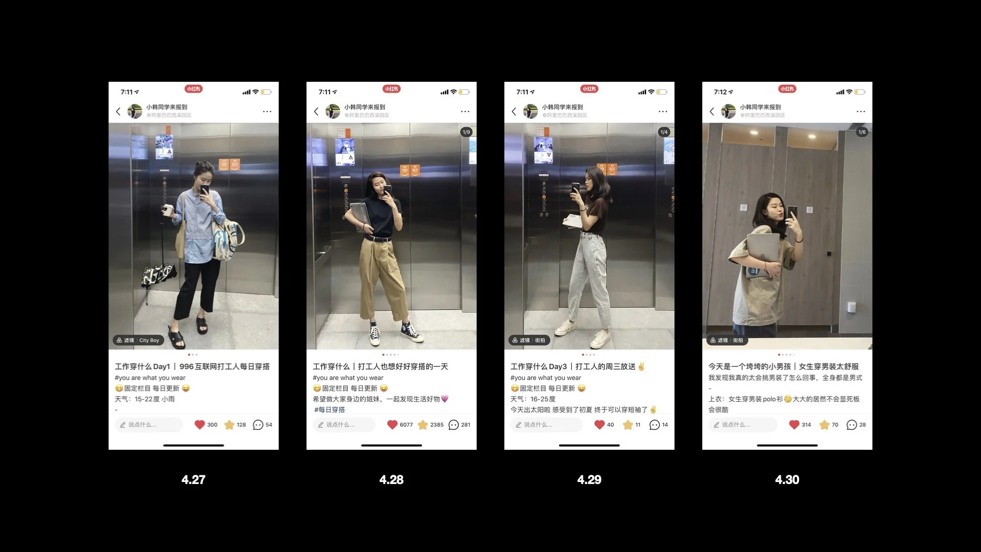 I identified a new demand among women for athletic wear that integrates with the rhythm of daily life, blending into everyday casual outfits, not just for fitness. Consequently, I set the scenes in representative locations like ’supermarkets,’ ’urban street views,’ and ’cycling,’ capturing leisure-style pairings that blur the lines between sportswear and everyday wear. The post successfully garnered 5,000 interactions.